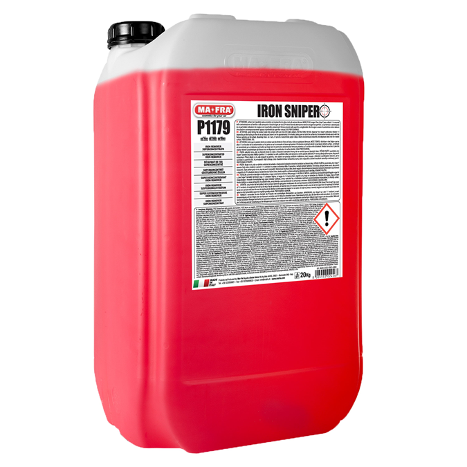 Eisenhaltige Verunreinigungen auf der Carrosserie oder auf den Felgen lassen sich mit herkömmlichen Reinigungsmethoden nicht beseitigen. Dank seiner innovativen Formel wandelt Iron Sniper eisenhaltige Rückstände chemisch um und löst sie auf. Die rote Lösung lässt sich je nach Hartnäckigkeit der Verschmutzung pur oder verdünnt auf das Fahrzeug aufsprühen. Dank seiner hohen Konzentration kann Ma-Fra Iron Sniper mit Wasser bis zu 1:1 verdünnt werden und ist daher sehr vielseitig und wirtschaftlich einsetzbar. Sobald die Dekontamination der Oxide und Eisenteilchen beendet ist, wechselt die Farbe bei den betroffenen Stellen zu ocker und Ma-Fra Iron Sniper kann abgespült werden. Mit dem geringen PH-Wert von 5.5, kann Iron Sniper auch zur Beseitigung des Flugrosts auf dem ganzen Auto verwendet werden.