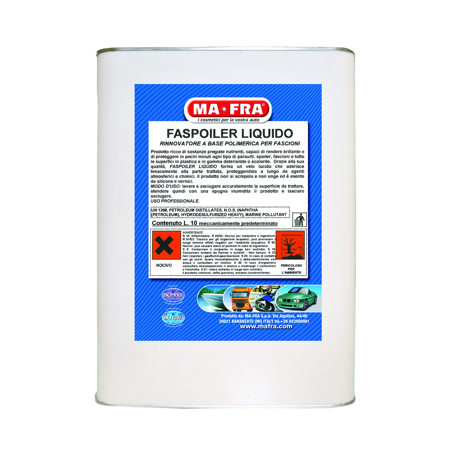 Erneuerer von Stossstangen auf Polymerbasis. FASPOILER ist das Produkt für diejenigen, die sich nicht zufriedenstellen wollen und stets auf der Suche nach der Perfektion sind. Dieses Produkt kann auf einen Streich – ohne zu Schmieren - Stossstangen, Seitenstreifen, Spoiler, Wagenverdecke usw. erneuern. Reich an wertvollen und pflegenden Substanzen auf Polymerbasis, bildet das FASPOILER einen glänzenden, durchsichtigen und schützenden Film, der an den behandelten Oberflächen haftet und jede beliebige Oberfläche aus Glasfaserkunststoff (Stossstangen und andere), Plastik - durch längere Sonneneinwirkung verfärbt oder beschädigt wurden - und jedes beliebige Element aus Gummi, erneuert. Benutzt man regelmässig das FASPOILER beugt man Entfärbungen und Alterungen der ausgesetzten Teile vor. Die Schicht die sich auf der behandelten Oberfläche bildet, widersteht dauerhaft den Einflüssen durch warmes oder kaltes Wasser, Sonne oder Staub und verhindert den störenden, rissigen Effekt, da sie unsichtbar bleibt.