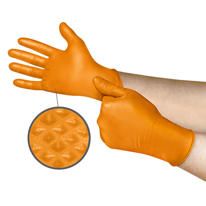 Einweghandschuhe aus Nitril für sicheren Halt und dauerhaften Schutz. Die Mega-Textur-Oberfläche gewährleistet stets einen sicheren Griff, sowohl auf nassen als auch trockenen Oberflächen. Die lebendige orangene Farbe erhöht die Sichtbarkeit während der Arbeit, während die robuste Formulierung dauerhaften, dennoch komfortablen Handschutz gewährleistet.