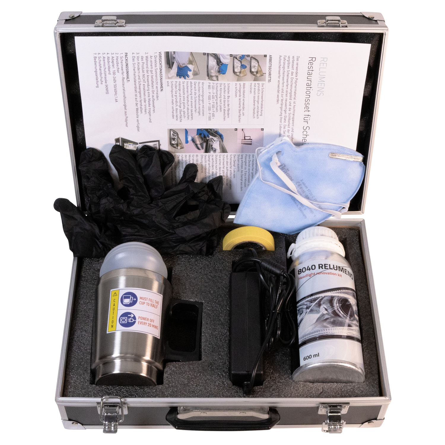 Mit dieser Polymer Beschichtung können alterungsbedingte matte und vergilbte Scheinwerferscheiben hochtransparent aufbereiten werden. Das aufgetragene Polymermaterial ist hochtransparent und zeichnet sich durch seine starke Haftung aus.Das Set kann zur Neubeschichtung und Verlängerung der Lebensdauer von allen Kunststoff-Scheinwerferabdeckungen verwendet werden. Vorteile: - Scheinwerfer müssen zur Bearbeitung nicht ausgebaut werden. - Einfache Applikation - Keine Staubeinschlüsse - Kurze Trocknungszeit (ca. 15 Minuten) Set beinhaltet: - Koffer- Dampfbehälter mit Ausguss - Polymerflüssigkeit 600ml - Netzteil - Abdeckband - 2 Atemschutzmasken - 2 Paar Handschuhe- Gebrauchsanleitung