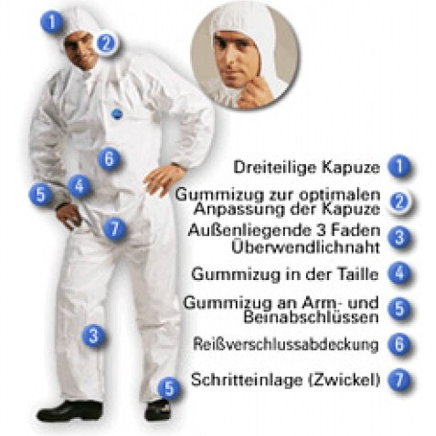- Combinaison de protection catégorie III - Vêtement de protection chimique en polyéthylène - Haute protection contre les acides inorganiques, particules et fibres - Robuste - Résistant à l'abrasion - À faible peluchage - Respirant - Antistatique - Elastiques aux manches, à la cagoule, aux chevilles et à la taille - Rabat extérieur sur la fermeture éclair jusqu'au menton